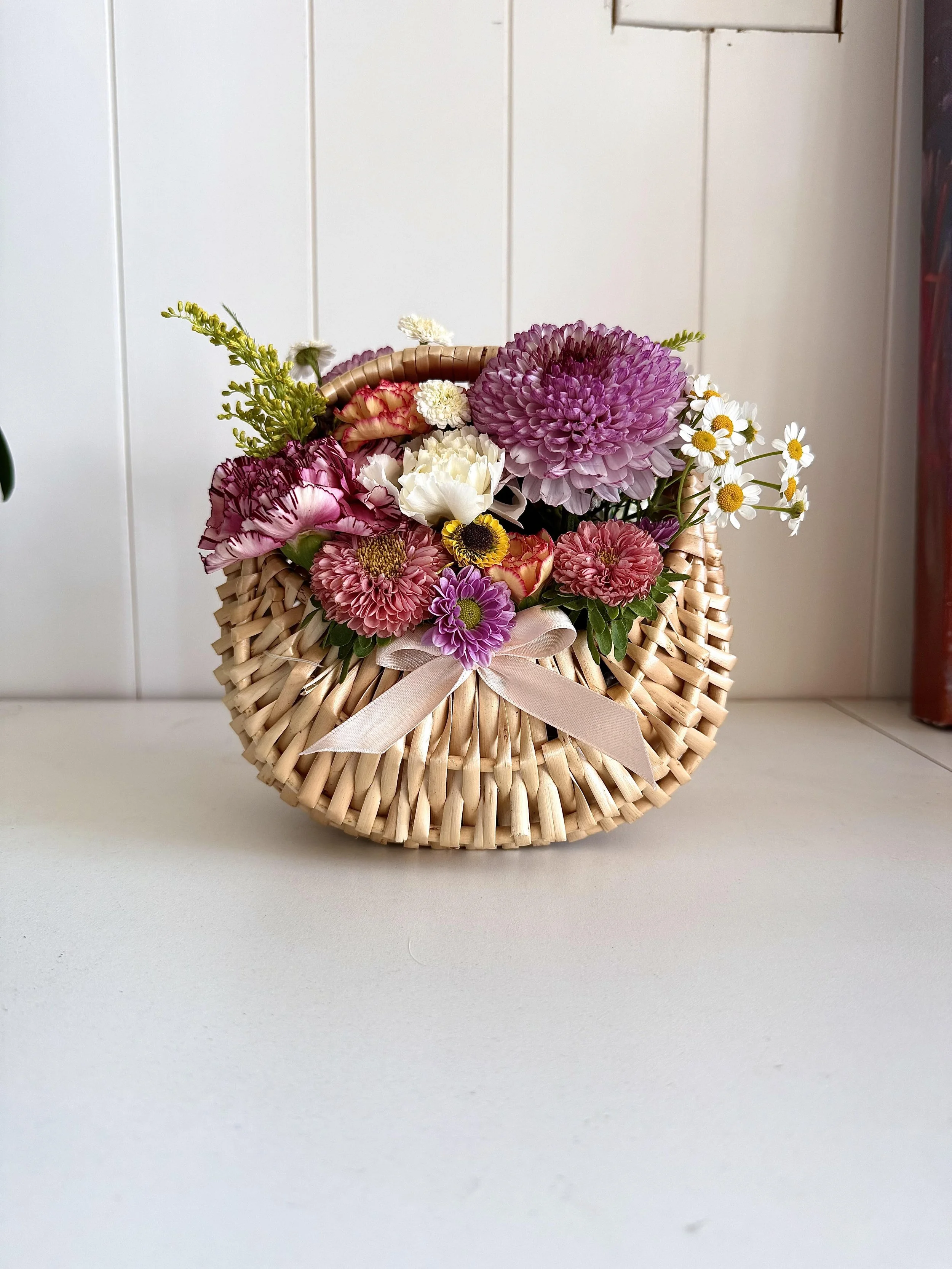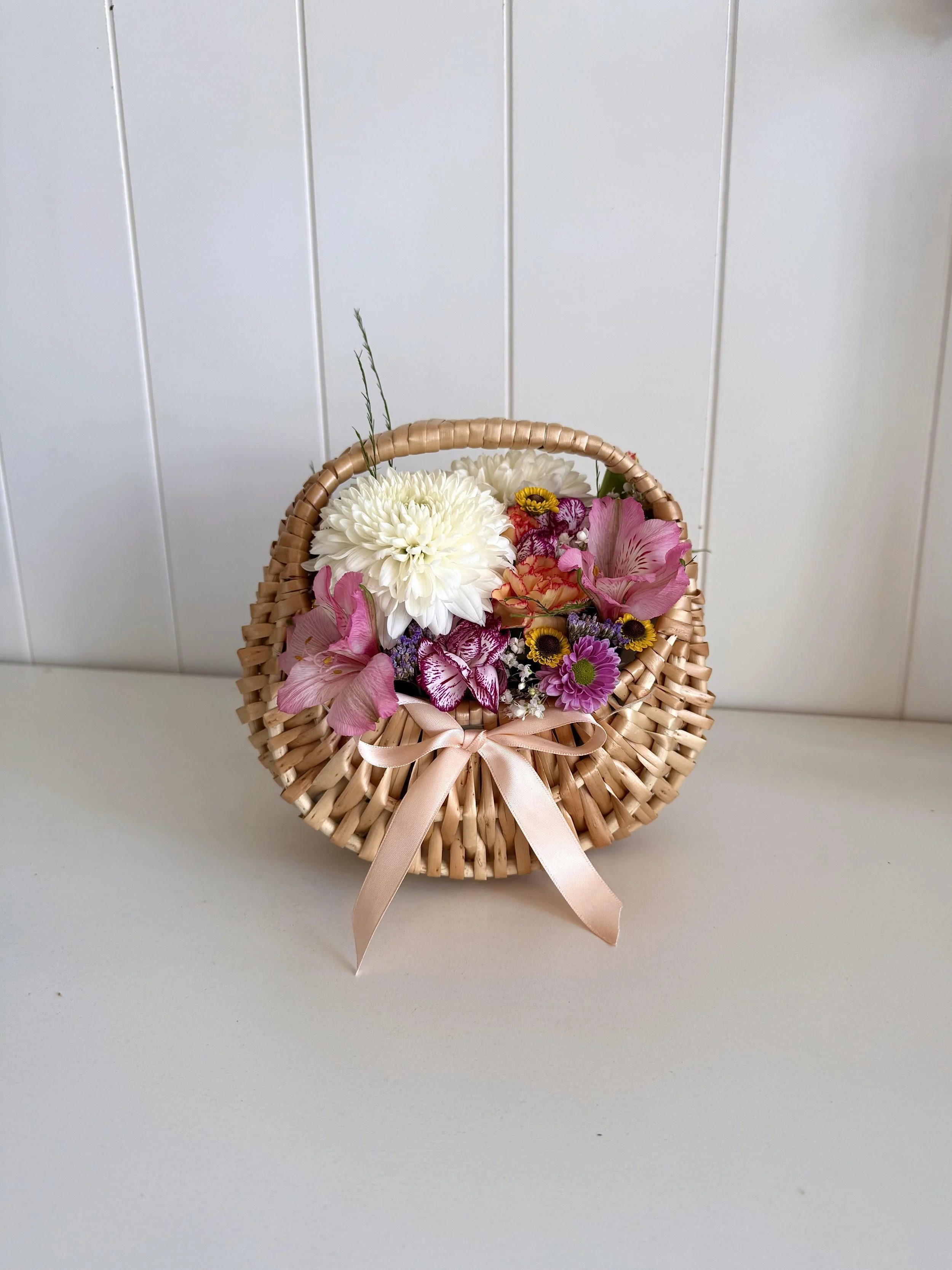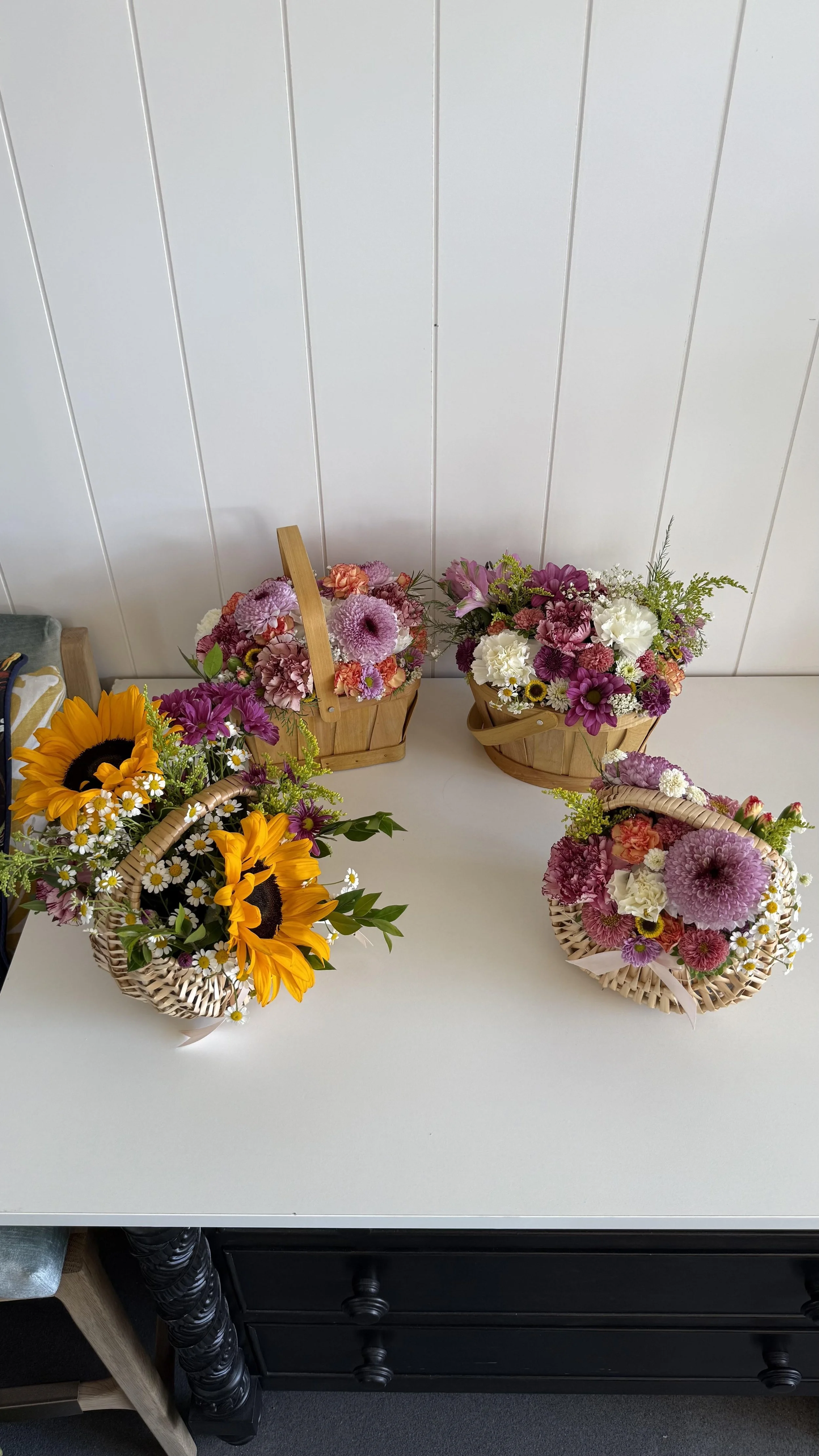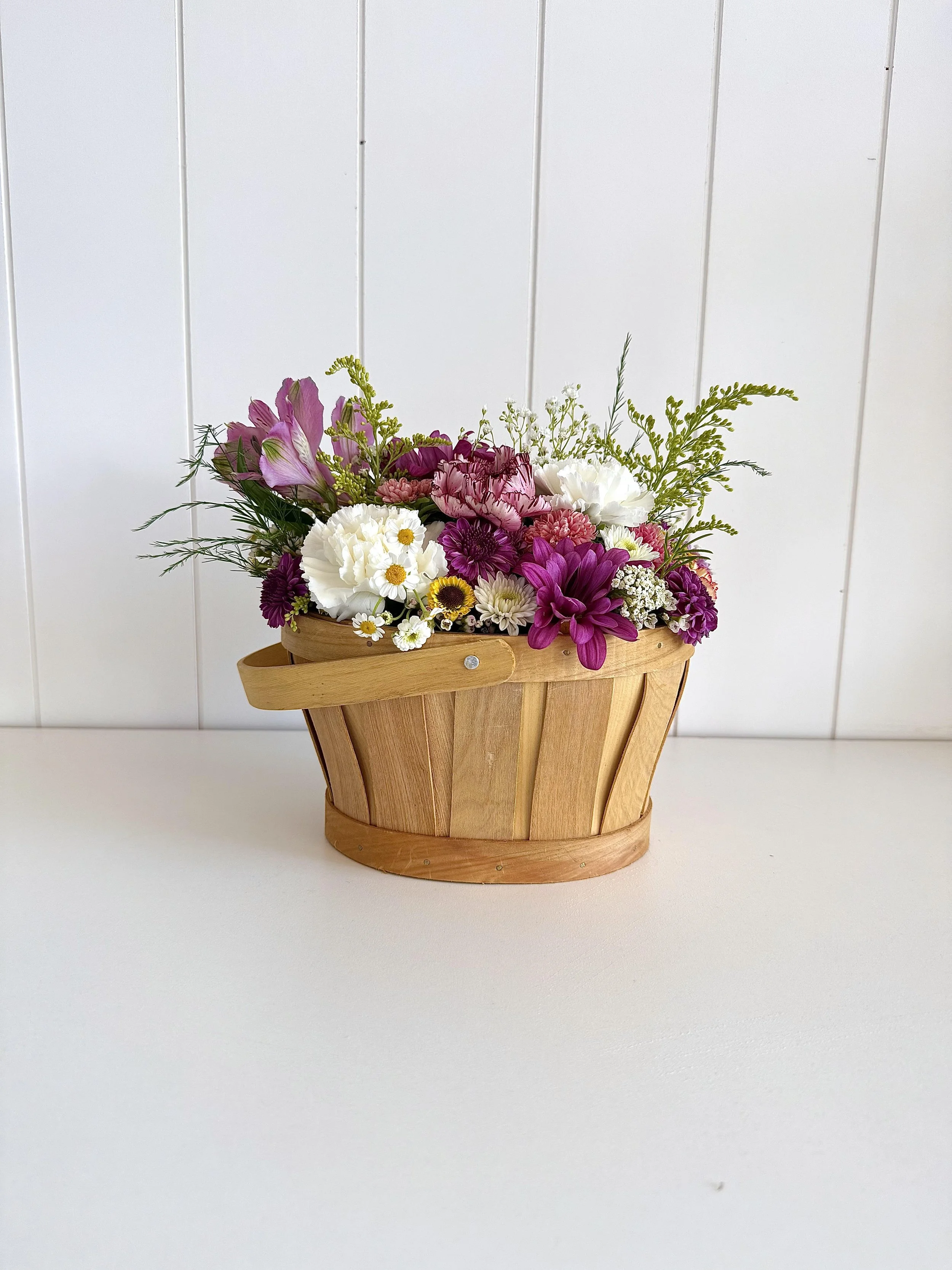 Enjoy one of our small basket arrangements with the blooms in current season. These are perfect for gifting, center pieces, or just for enjoyment in your home. These Baskets are delightful and are sure told bring a smile to anyone.